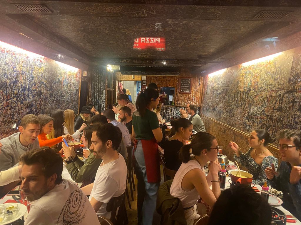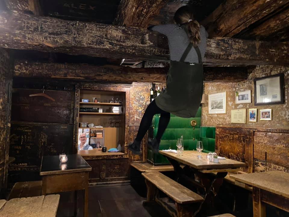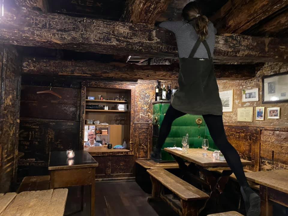Oepfelchammer Restaurant in Zurich Old Town. Can you guess what Emily is doing?
